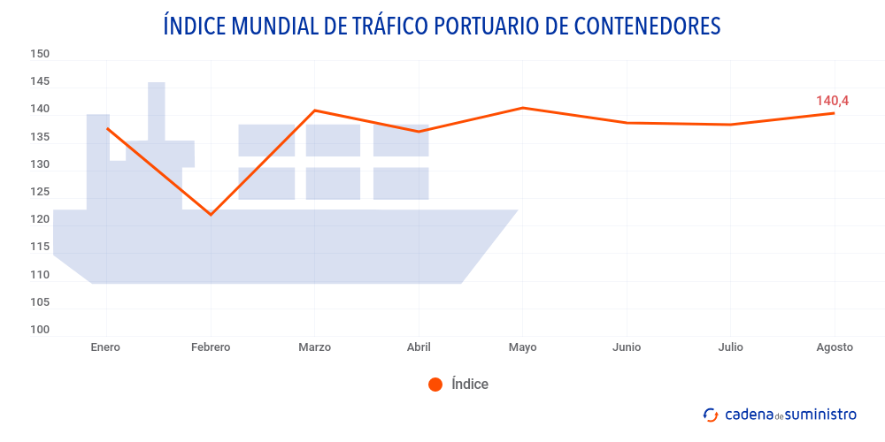 Aunque se mantuvo estable en el entorno de los 138 puntos en los meses de junio y julio, el Índice Mundial de Tráfico Portuario de Contenedores de Drewry ha ganado dos puntos en agosto hasta los 140,4, situándose un 3,5% por encima del dato del mismo mes de 2020 y un 3,9% por encima del de agosto de 2019.