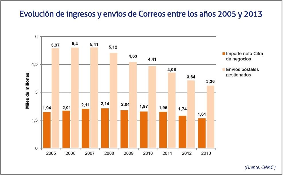 Correos, principal operador, concluyó 2013 con ingresos de 3.360 millones de euros, importe un 7,6% inferior al del ejercicio precedente, con lo que encadenó seis años de descensos en los que acumula una caída de ingresos del 62%.