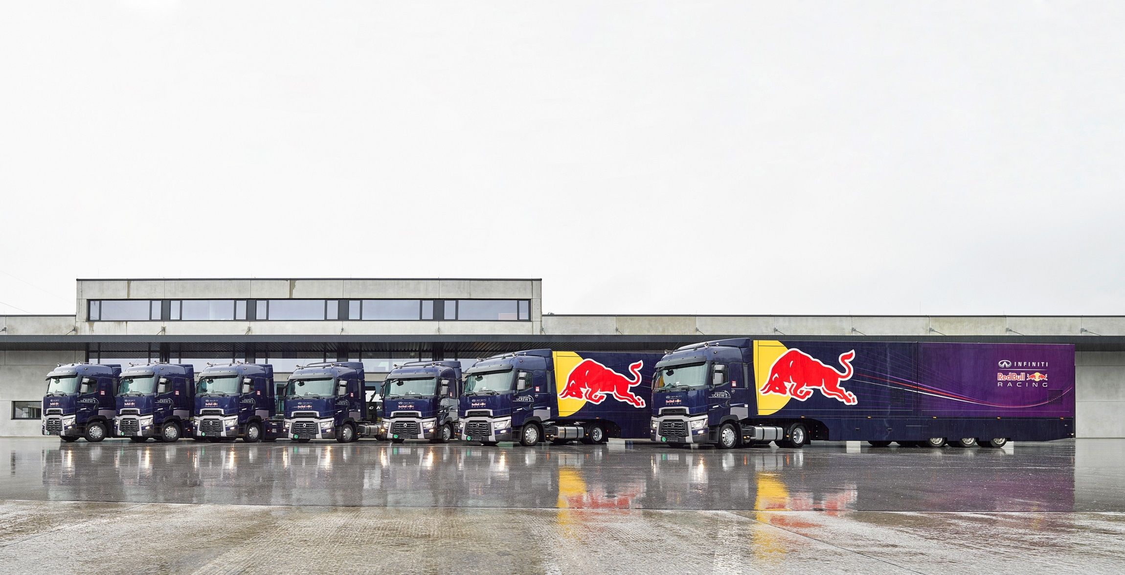 Siete camiones Renault Trucks T 520 High acompañan a Red Bull por Europa en la categoría reina del automovilismo, para trasladar la 'Tree House', la recta de boxes alargada, del equipo de Fórmula 1 Infiniti de Red Bull de un gran premio a otro.