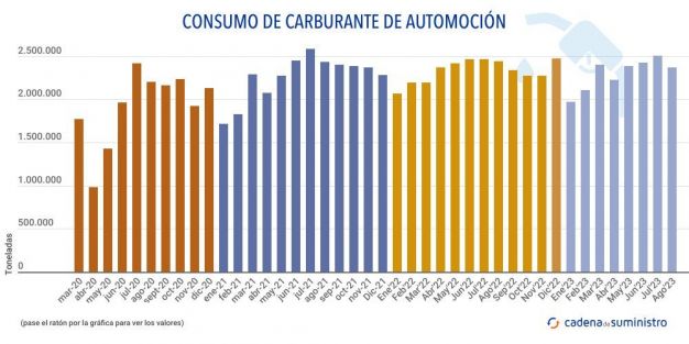El consumo de carburantes de automoción ha caído un 3% en España en el octavo mes de 2023, alcanzando las 2.370.000 toneladas, según el último informe de Cores. En los primeros ocho meses, ha retrocedido en un 0,9% hasta las 18.401.000 toneladas.