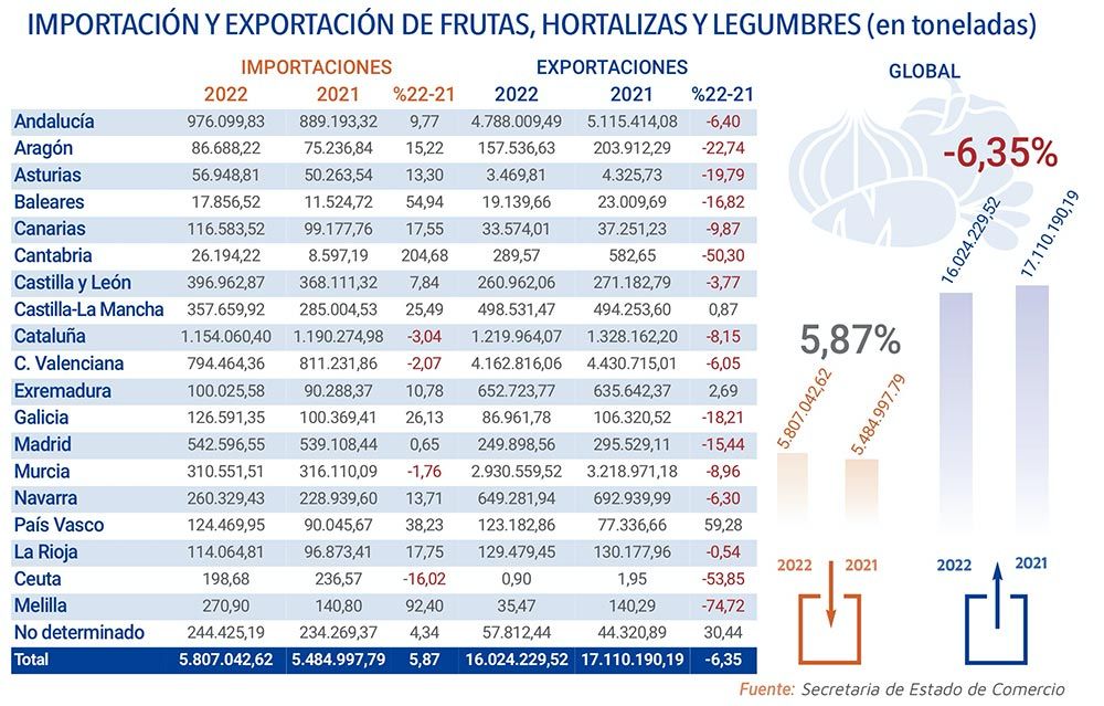 En su caso, la exportación de hortalizas se redujo un 7% en 2022 respecto a 2021, totalizando 5,3 millones de toneladas.