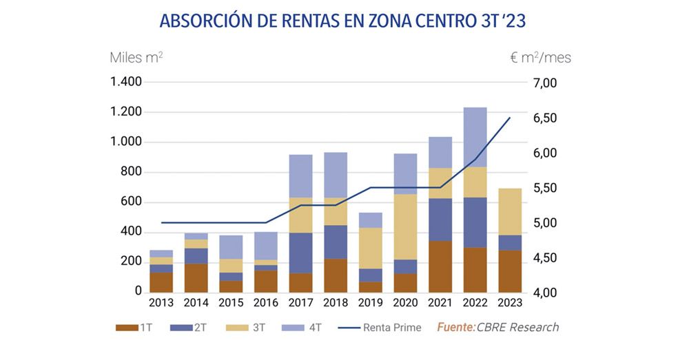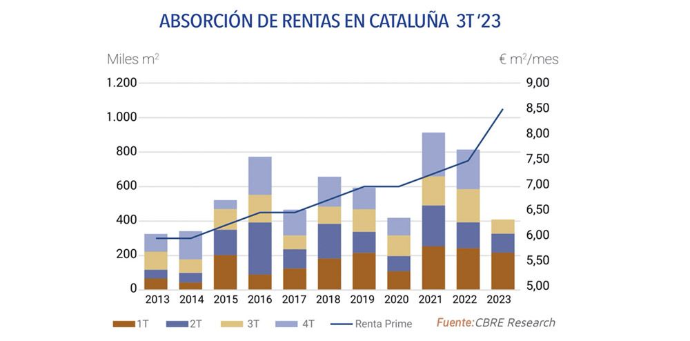 Por lo que respecta a las rentas, la evolución de la renta prime en zona centro continúa al alza, con un incremento del 4% respecto del trimestre anterior, llegando ya en el ámbito local los 6,50 €/m²/mes, mientras que en Cataluña la escasez de oferta, principalmente en zonas prime, acompañada de la entrada de activos de última generación continúa elevando la renta prime hasta los 8,50 €/m²/mes, un 3% más que el trimestre pasado y un 13,3% más respecto al mismo periodo de 2022.