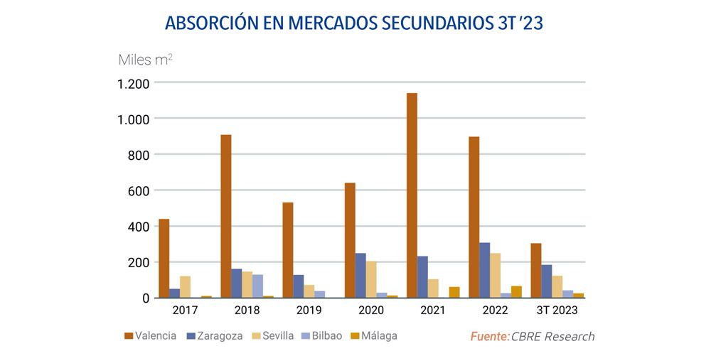 Así mismo, en otras zonas, CBRE estima que se han cerrado 57.778 m² de supreficie logística en el tercer cuarto de 2023, un 58% menos que hace un año. En lo que va de año, los mercados secundarios del inmologístico español han alcanzado una absorción total de 340.000 m², un 24% del total del país, con especial protagonismo para Zaragoza y Bilbao.