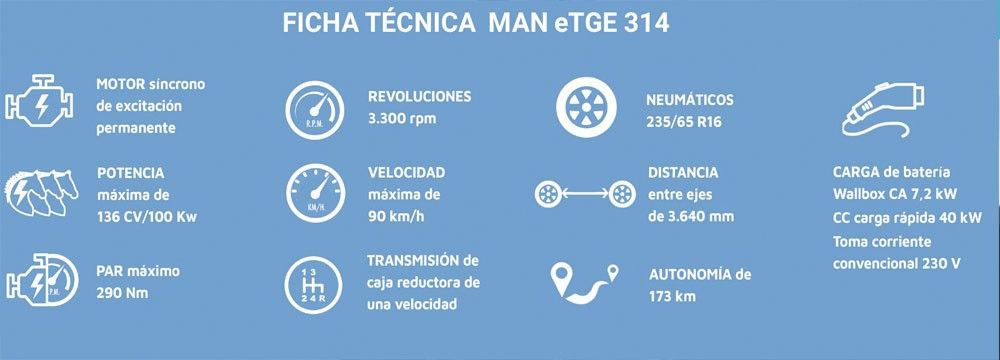 La versión totalmente eléctrica de la furgoneta MAN está disponible en un principio como furgoneta con techo alto, con un volumen de carga de casi 11 metros cúbicos y una carga útil de aproximadamente una tonelada. El modelo cuenta con una autonomía de hasta 173 kilómetros, distancia que, según los cálculos del fabricante, cubre alrededor de las dos terceras partes de todos los trayectos por ciudad que actualmente se realizan con vehículos de motor de combustión interna.