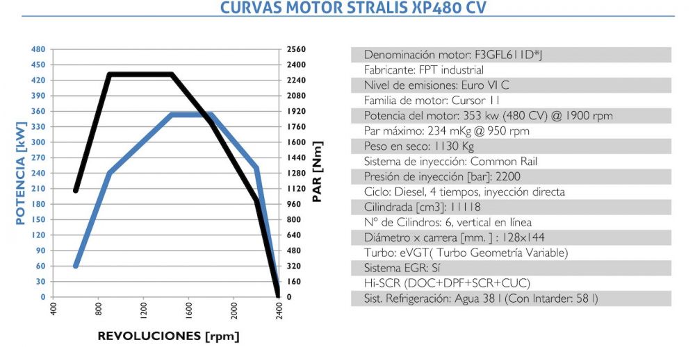 El Stralis XP equipa un motor diésel Cursor II de 11 litros, con 480 CV de potencia y un par de 234 mkg. (2.300 Nm).