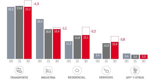 De igual modo, la demanda de energía también ha caído un 4,1% en los sectores residencial y terciario, mientras que, por contra, la demanda energética del transporte se ha incrementado un 11,1% entre 2015 y 2016, como consecuencia del cambio de ciclo económico.