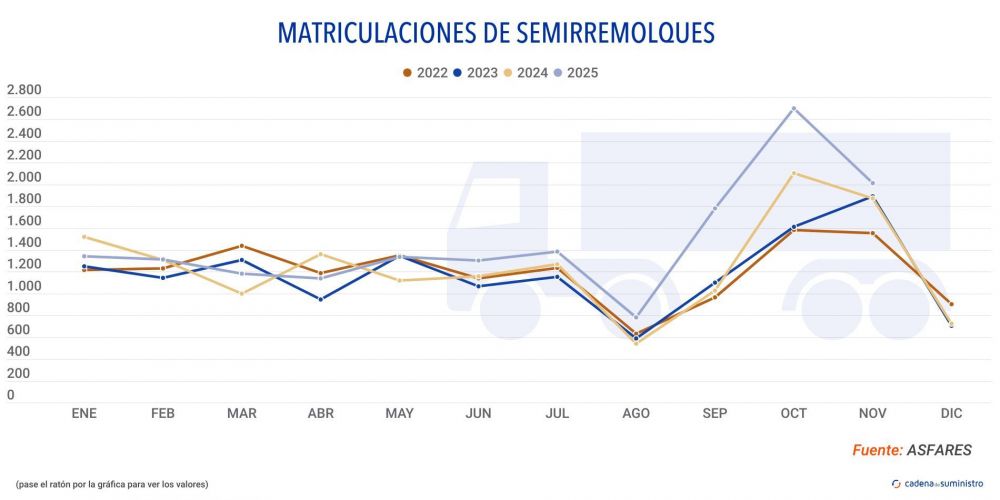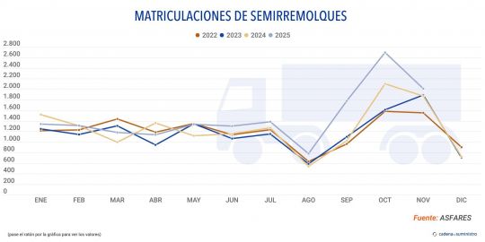 Según los datos de Asfares, la asociación que agrupa a los fabricantes españoles de remolques, semirremolques, cisternas y todo tipo de carrocerías como lonas, basculantes, furgones, frigoríficos y contenedores, además de los fabricantes de equipos y componentes para estos vehículos, durante el undécimo mes del ejercicio se han matriculado un total de 2.014 semirremolques, un 7,47% por encima de las 1.874 unidades registradas durante octubre de 2024.