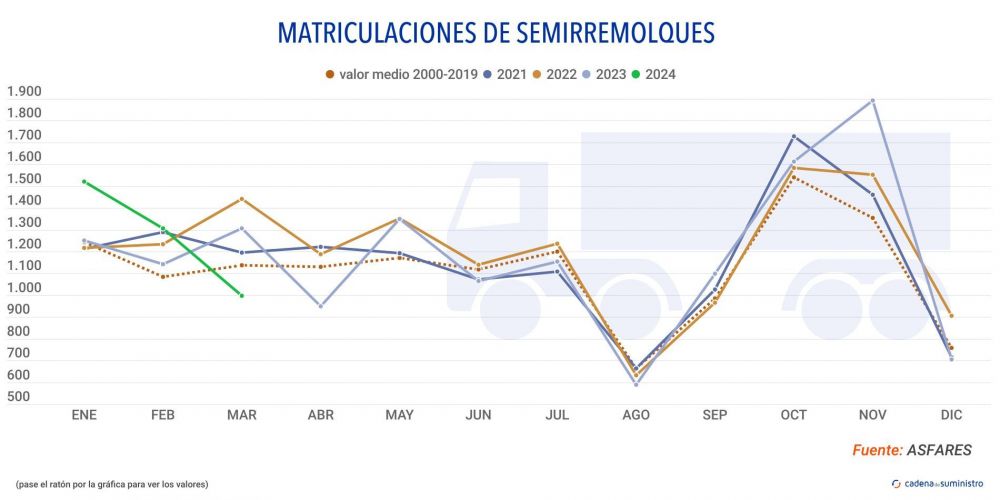 Así pues, este mercado acumula en los tres primeros meses del ejercicio un total de 3.824 matriculaciones de semirremolques, lo que implica un ascenso anual de un 3,38% con respecto al mismo tramo de 2023.