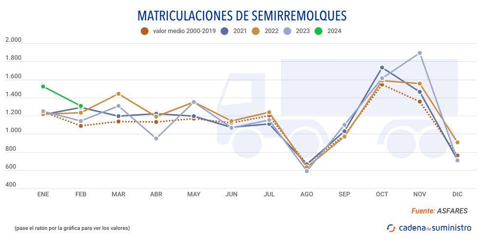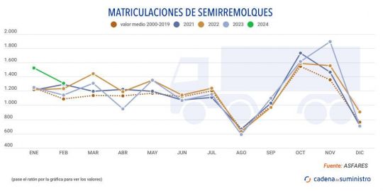 Así pues, este mercado acumula en los dos primeros meses del ejercicio un total de 2.826 matriculaciones de semirremolques, lo que implica un ascenso anual de un 18,09% con respecto al mismo tramo de 2023.