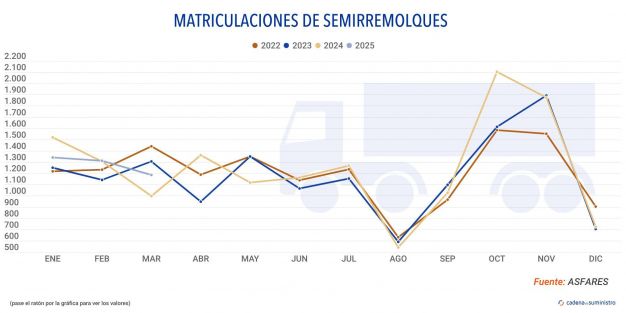 Según los datos de Asfares, la asociación que agrupa a los fabricantes españoles de remolques, semirremolques, cisternas y todo tipo de carrocerías como lonas, basculantes, furgones, frigoríficos y contenedores, además de los fabricantes de equipos y componentes para estos vehículos, durante el tercer mes del ejercicio se han matriculado un total de 1.185 semirremolques, un 18,74% por encima de las 998 unidades registradas durante marzo de 2024.