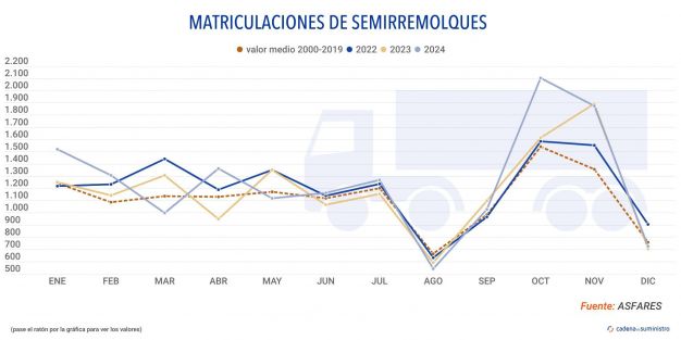 Así pues, este mercado acumula entre todo el ejercicio un total de 15.009 matriculaciones de semirremolques, lo que implica un ascenso anual de un 6,33% con respecto a 2023.