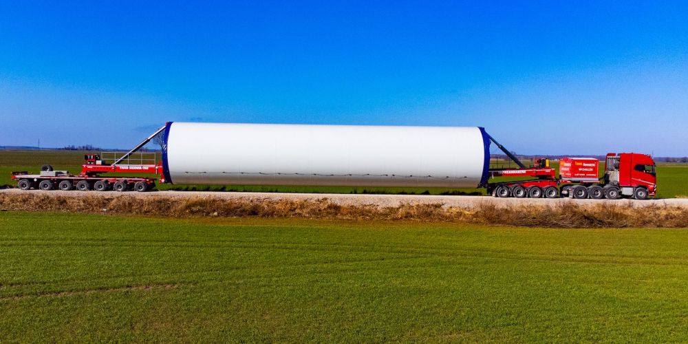 Todos los remolques de la familia Mega Windmill están especialmente diseñados para transportar grandes secciones de torres de turbinas eólicas de hasta aproximadamente 100 toneladas sin cama de carga y sin necesidad de grúas para la carga y descarga.
