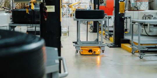 Los AMR se mueven mediante sensores y cámaras de 360 grados a velocidades de hasta dos metros por segundo, transportando neumáticos entre la fabricación, las prensas de curado y el área de control de calidad.