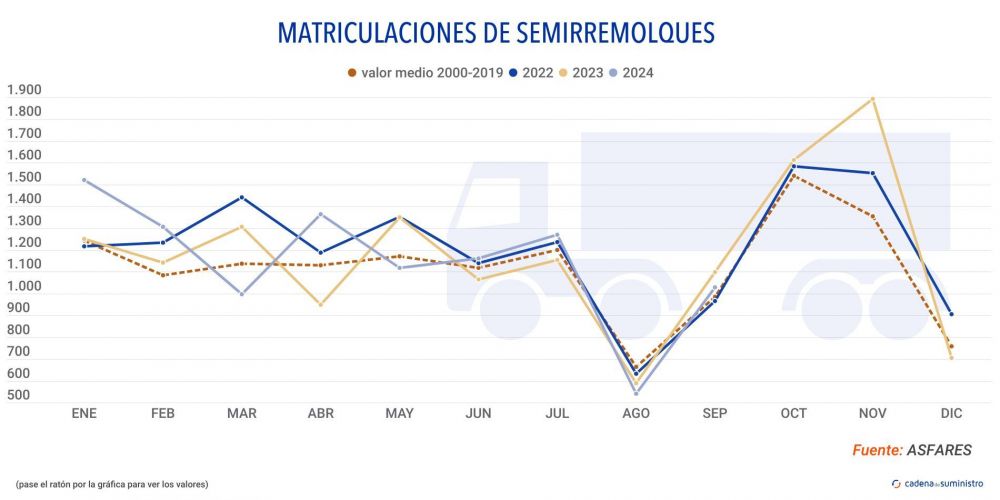 Según los datos de Asfares, la asociación que agrupa a los fabricantes españoles de remolques, semirremolques, cisternas y todo tipo de carrocerías como lonas, basculantes, furgones, frigoríficos y contenedores, además de los fabricantes de equipos y componentes para estos vehículos, durante el noveno mes del ejercicio se han matriculado un total de 1.029 semirremolques, un 6,37% por debajo de las 1.099 unidades registradas durante septiembre de 2023.