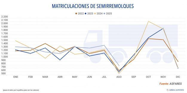 El mercado suma en los ocho primeros meses del ejercicio unas matriculaciones totales de 9.781 semirremolques, un 5,43% más que en el mismo tramo de 2024.