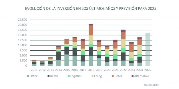 El informe refleja una previsión de crecimiento de la inversión para este año cercana al 15%, lo que situaría el volumen total en el entorno de los 16.000 millones, frente a los 14.000 millones de 2024. Esta previsión podría, incluso, verse incrementada si aumenta el cierre de operaciones corporativas, siguiendo la tendencia observada en los últimos meses.