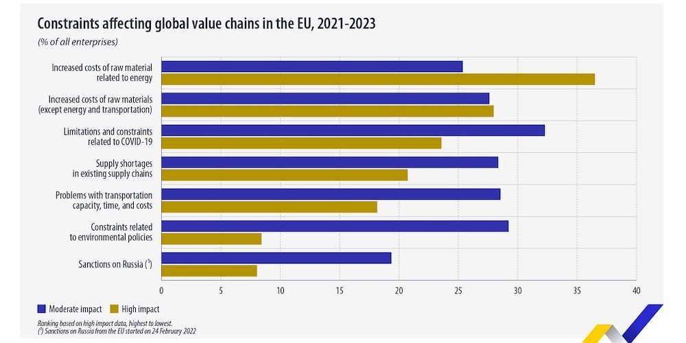 De igual modo, las cadenas de valor de las empresas de la Unión Europea también se han visto impactadas por las sanciones impuestas a Rusia tras su invasión de Ucrania y por las políticas de sostenibilidad medioambiental.