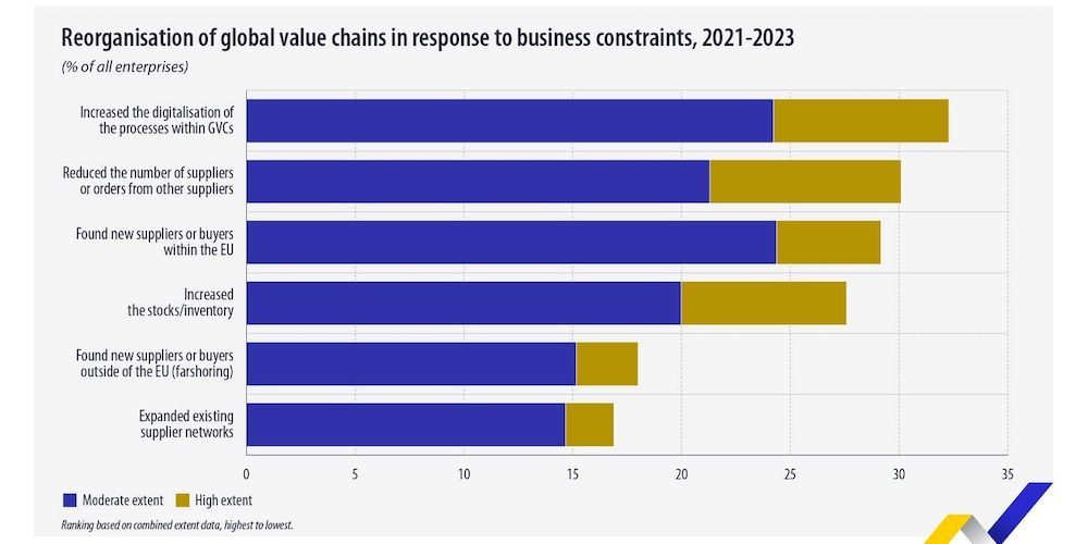 De manera particular, las medidas más frecuentes que han adoptado se centran una mayor digitalización de los procesos dentro de la cadena de valor global, seguida por un 32%, la priorización de los proveedores más fiables, para un 30%, y la búsqueda de nuevos proveedores dentro de la UE, con un 29%.