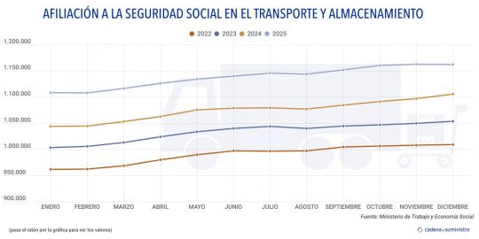 El volumen de afiliados a la Seguridad Social en el segmento de transporte y almacenamiento ha terminado 2025 con una ligera tendencia a la baja.