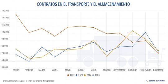 Así pues, en el cuarto mes de este año se han registrado 74.534 contratos de trabajo nuevos en el sector del transporte y la logística, un 3,54% menos que en el mismo mes de 2024 y un 2,41% menos que en marzo de este mismo ejercicio.