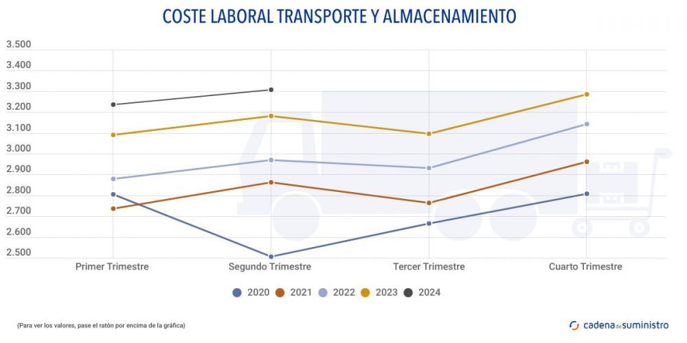 En el segmento de almacenamiento y actividades anexas, el coste laboral alcanza durante el segundo trimestre de 2024 los 3.624,86 euros, un 1,96% más que en idéntico tramo de 2023.
