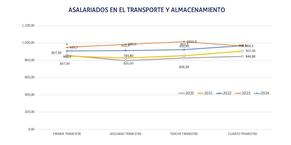 Así mismo, durante el primer trimestre de 2024, el INE ha registrado 985.800 asalariados en el sector de transporte y almacenamiento, un 3,08% más que hace un año y un 0,3% más que en el último trimestre de 2023.