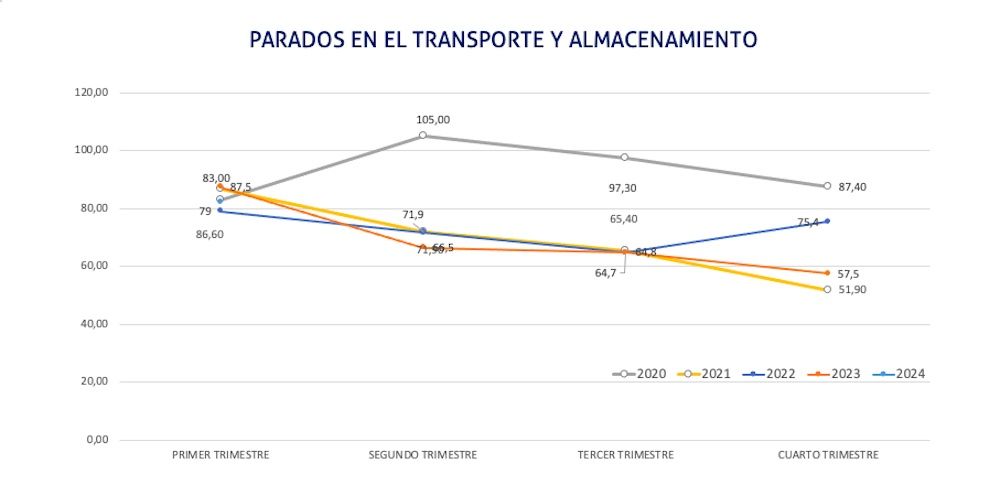 Por otro lado, durante el primer trimestre de 2024, el sector del transporte y almacenamiento contaba con un total de 82.200 parados, un 5,73% menos que en el mismo trimestre de 2022, pero un 41,72% más que en el último cuarto del año pasado.