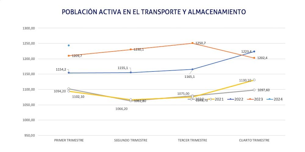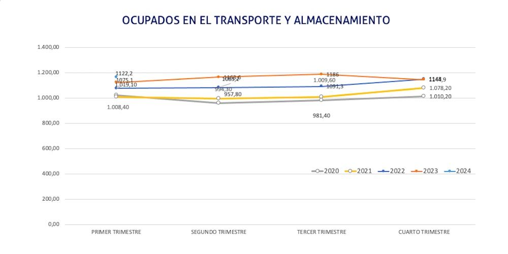 Así mismo, el sector español de transporte y almacenamiento cuenta en el último cuarto de 2023 con una población activa total de 1.243.500 personas, un 1,5% más que en el último trimestre de 2023, además de un 1,49% más que en el mismo cuarto del año pasado.