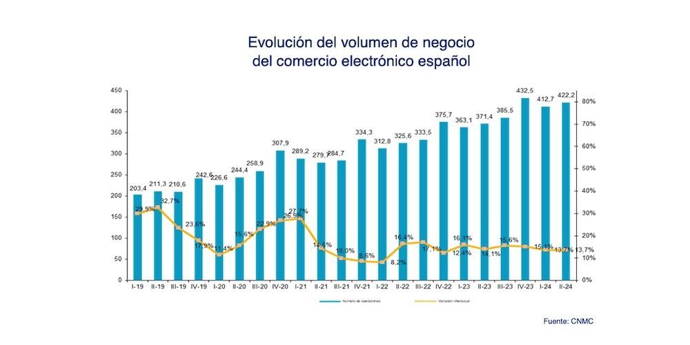 Así mismo, por número de transacciones, en el segundo trimestre del año pasado se han registrado más de 422 millones de transacciones de comercio electrónico, un 13,7% más que un año antes.
