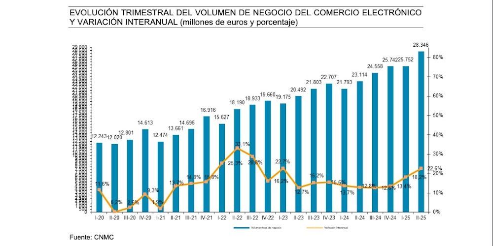 La facturación del comercio electrónico en España aumentó en el segundo trimestre de 2025 un 22,6% anual hasta alcanzar los 28.346 millones de euros, según los últimos datos de la Comisión Nacional de los Mercados y la Competencia.