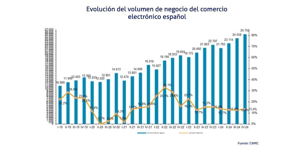 Así mismo, Competencia calcula que la facturación del comercio electrónico en España ha aumentóado en el cuarto trimestre de 2024 un 13,4%, hasta alcanzar los 25.742 millones de euros.