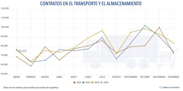 Así pues, en el primer mes de este año se han registrado 75.473 contratos de trabajo nuevos en el sector del transporte y la logística, un 1,73% menos que en el mismo mes de 2025 y un 10,51% menos que en diciembre del pasado ejercicio.