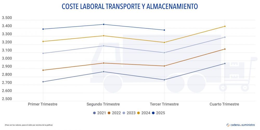 El coste laboral de las empresas españolas dedicadas a la actividad de transporte y almacenamiento ha crecido un 4,76% en el tercer trimestre de 2025 con respecto al mismo período de 2024, aunque, al msimo tiempo, ha disminuido en un 2,02% con respecto al segundo cuarto de este mismo ejercicio.