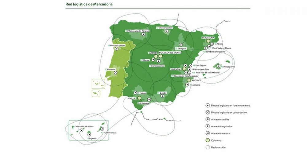 La red logística de la cadena valenciana suma 1,4 millones de metros cuadrados repartidos entre 17 bloques logísticos, uno en construcción en Almeirim, dos almacenes satélites, dos almacenes reguladores más y un almacén de material, desde los que se abastece a los 1.681 supermercados que la compañía tiene, con 1.632 en España y 49 en Portugal.