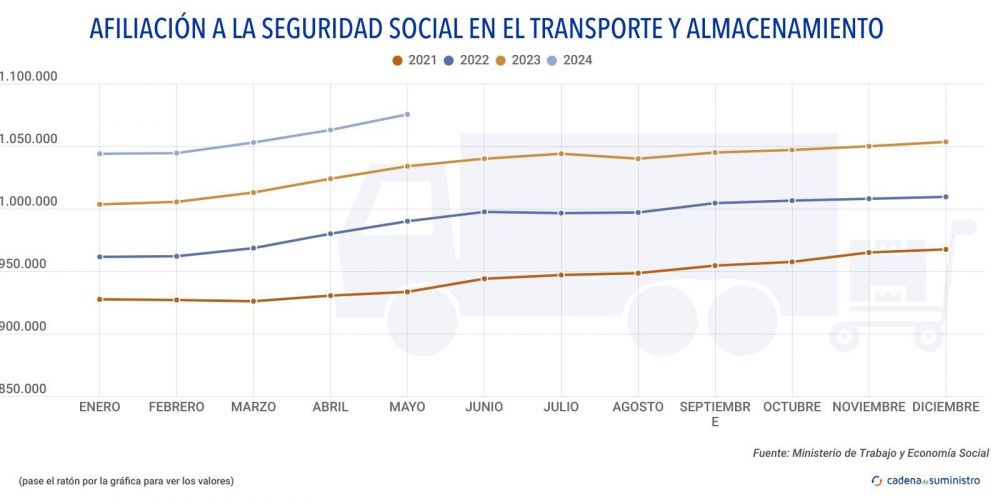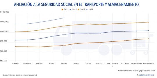 El volumen de afiliados a la Seguridad Social en el segmento de transporte y almacenamiento vuelve a incrementar su ritmo de crecimiento en el quinto mes de 2024 y, al mismo tiempo, supera con creces los registros de hace un año.