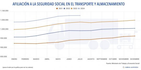 El volumen de afiliados a la Seguridad Social en el segmento de transporte y almacenamiento ralentiza su ritmo de crecimiento en el sexto mes de 2024 una vez hechas las contrataciones necesarias para la temporada alta del verano.