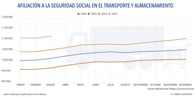 El volumen de afiliados a la Seguridad Social en el segmento de transporte y almacenamiento mantiene al comienzo de 2025 su tendencia al alza.
