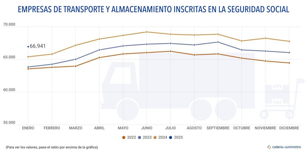 El sector español de transporte y almacenamiento ha terminado enero con un total de 66.941 empresas inscritas en la Seguridad Social, un 2,38% más que en enero de 2024.