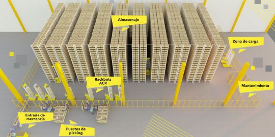 Particularmente, la primera fase de la actuación, cuya puesta en marcha está prevista en septiembre, contempla la integración de doce RackBots, que operarán en 20.000 ubicaciones de doble profundidad dispuestas en estanterías de diez metros de altura.