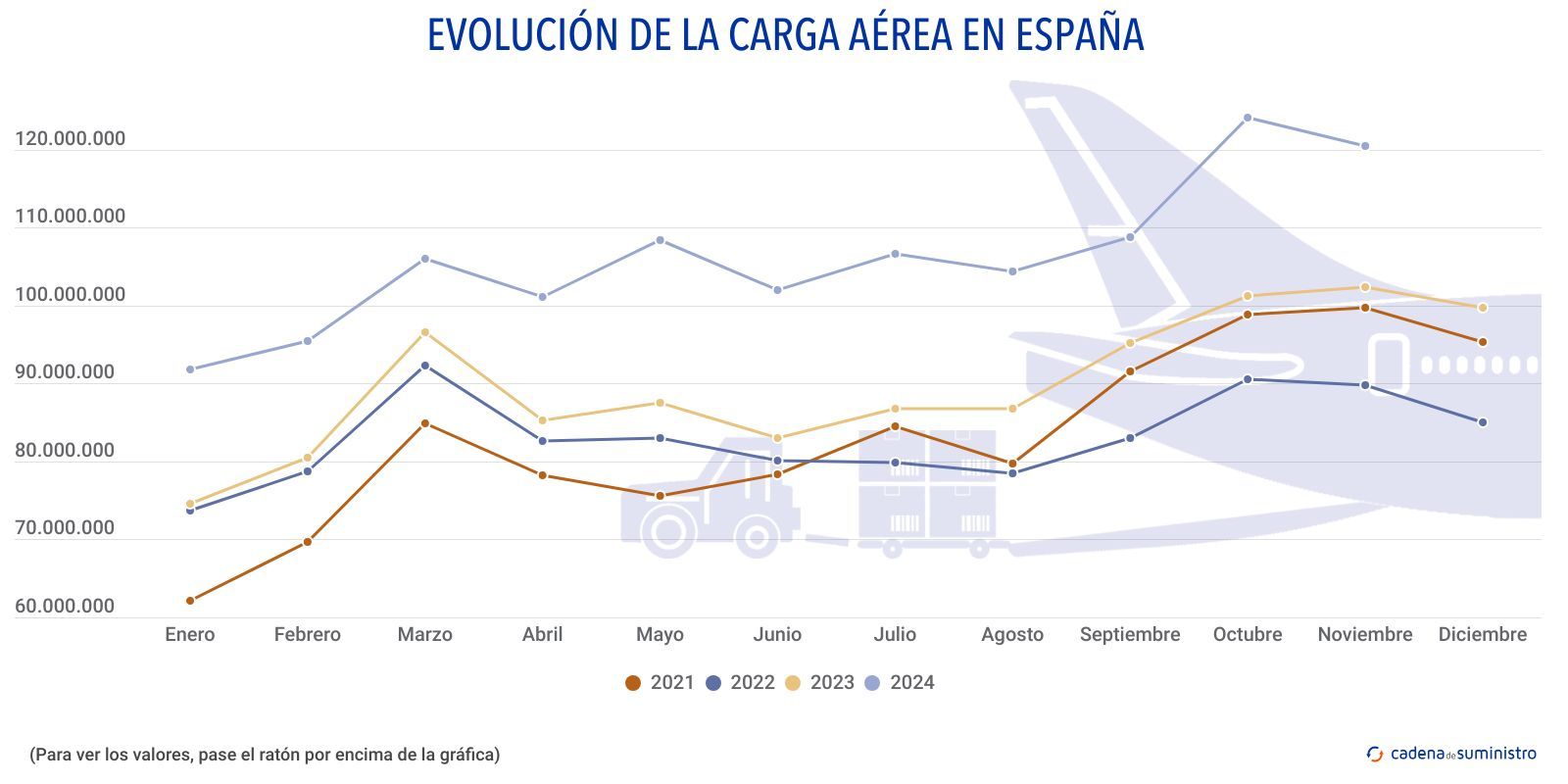Durante el pasado mes de noviembre, el sistema aeroportuario español ha movido un volumen mensual de 120.426.655 kg de mercancías, un 17,6% más que en el undécimo mes de 2023, aunque con menor ritmo de ascenso que en meses precedentes.