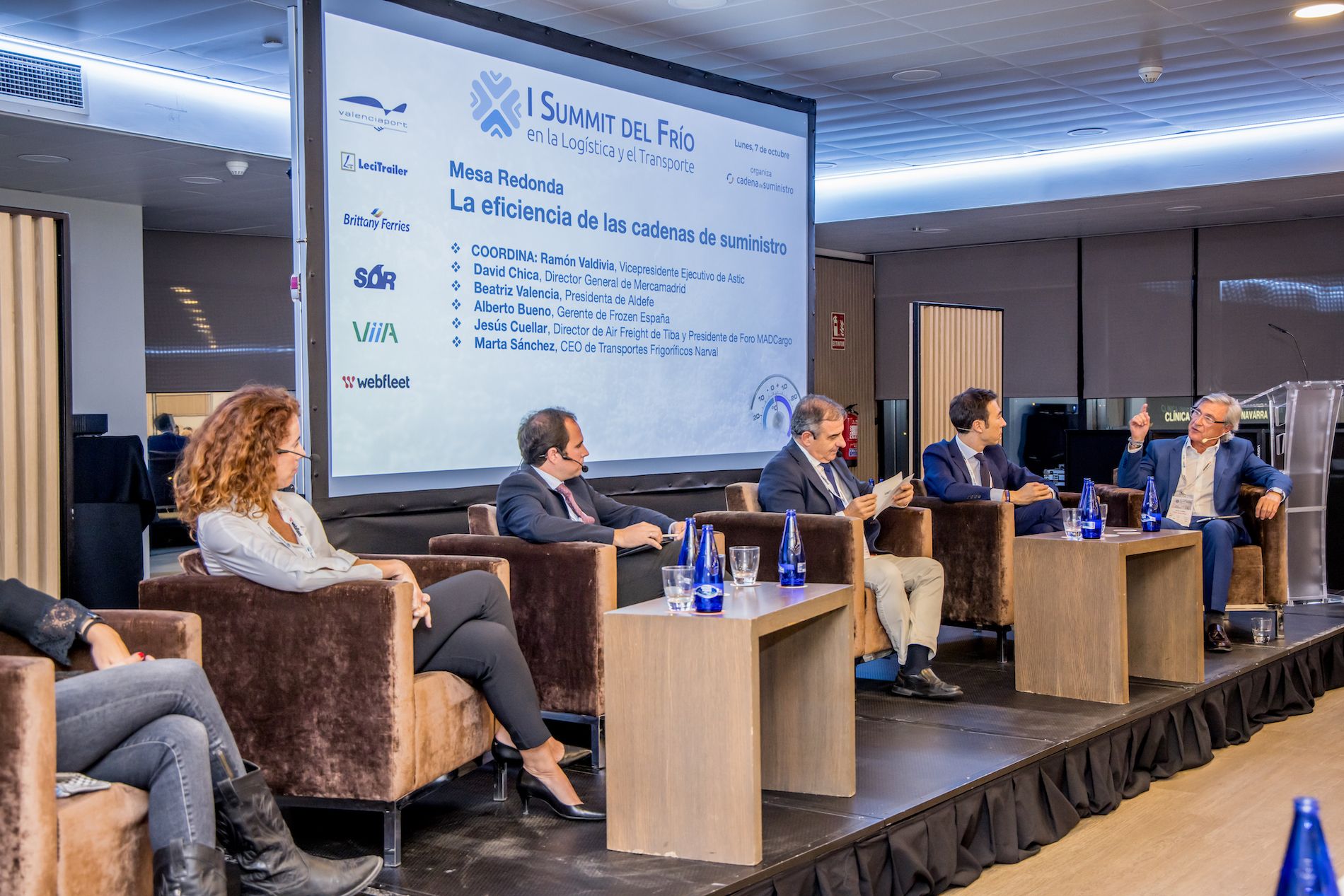 Para finalizar, una sgunda mesa redonda focalizada en la eficiencia de las cadenas de suministro ha reunido, con la moderación de Ramón Valdivia, vicepresidente ejecutivo de Astic, también a David Chica, director general de Mercamadrid, Beatriz Valencia, presidenta de Aldefe, Alberto Bueno, gerente de Frozen España, Jesús Cuellar, director de Air Freight de Tiba y presidente de Foro MADCargo, y a Marta Sánchez, CEO de Transportes Frigoríficos Narval.