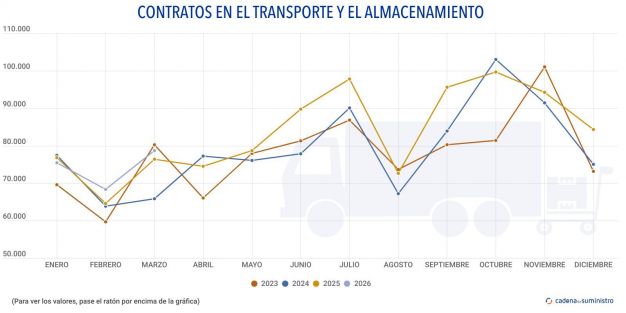 Así pues, en el tercer mes de este año se han registrado 78.691 contratos de trabajo nuevos en el sector del transporte y la logística, un 3,03% más que en el mismo mes de 2025.