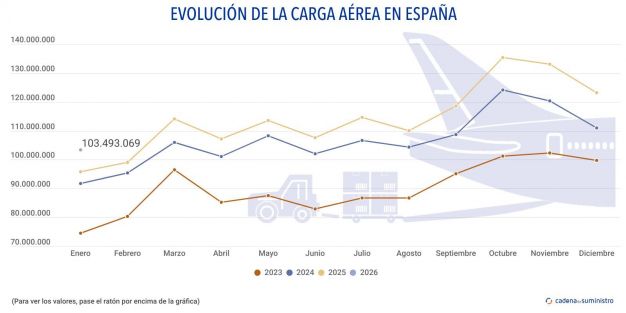 Durante el pasado mes de enero, el sistema aeroportuario español ha movido un volumen mensual de 103.493.069 kg. de mercancías, un 8% más que en el primer mes de 2025.