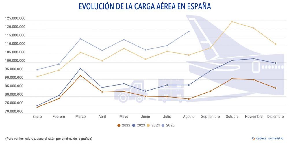 Durante el pasado mes de septiembre, el sistema aeroportuario español ha movido un volumen mensual de 118.549.106 kg. de mercancías, un 9% más que en el noveno mes de 2024.