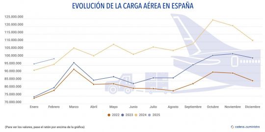 Durante el pasado mes de febrero, el sistema aeroportuario español ha movido un volumen mensual de 99.167.975 kg de mercancías, un 3,9% más que en el segundo mes de 2024.