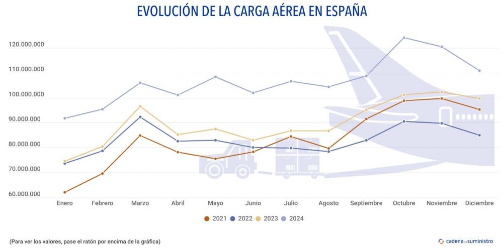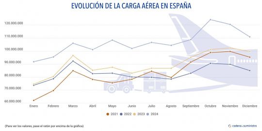 Durante el pasado mes de diciembre, el sistema aeroportuario español ha movido un volumen mensual de 110.980.468 kg de mercancías, un 11,3% más que en el duodécimo mes de 2023.