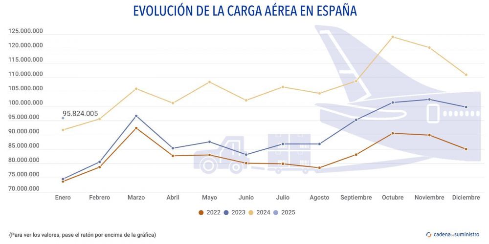 Durante el pasado mes de enero, el sistema aeroportuario español ha movido un volumen mensual de 95.824.005 kg de mercancías, un 4,4% más que en el primer mes de 2024.
