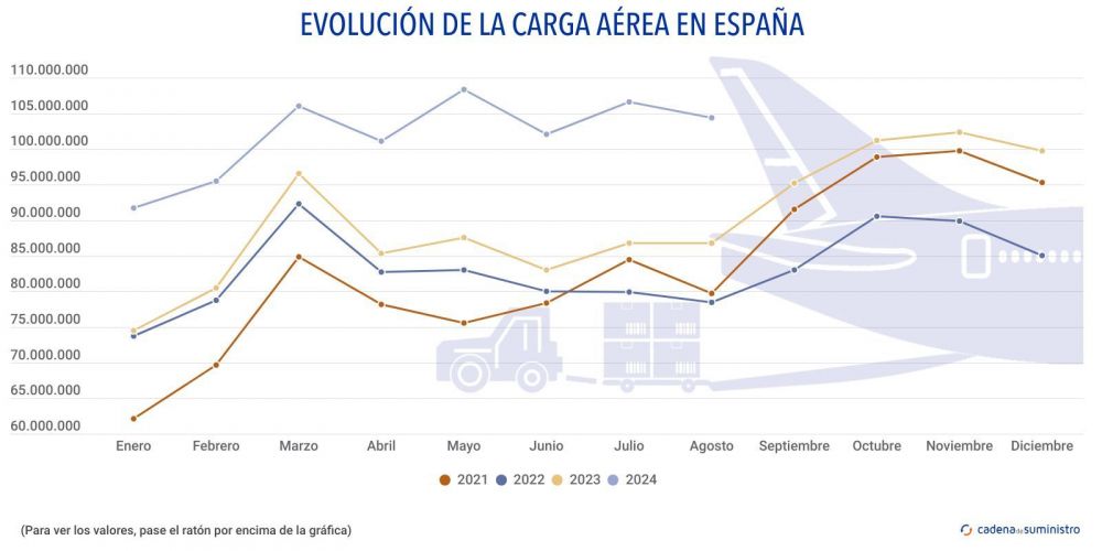Durante el pasado mes de agosto, el sistema aeroportuario español ha movido un volumen mensual de 104.435.398 kg de mercancías, un 20,3% más que en el octavo mes de 2023.