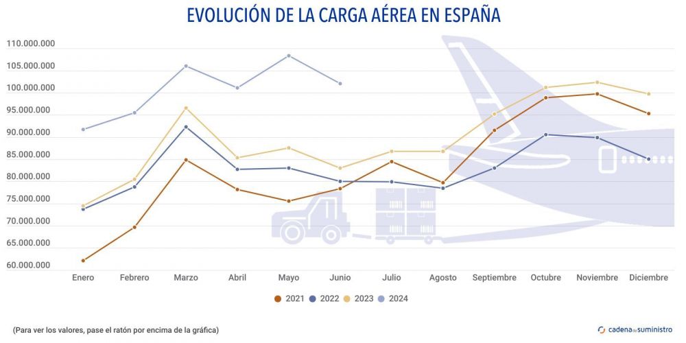 Durante el pasado mes de junio, el sistema aeroportuario español ha movido un volumen mensual de 102.037.162 kg de mercancías, un 22,9% más que en el quinto mes de 2023.