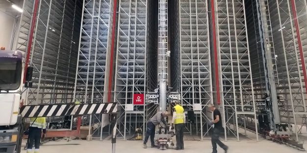Las obras han entrado ya en la fase de montaje de las estructuras verticales, con cinco de los seis almacenes ya instalados. Cada uno de los sistemas alcanza una altura de 19 metros, correspondiente a los mástiles de los transelevadores que sostienen las operaciones automatizadas de almacenamiento.